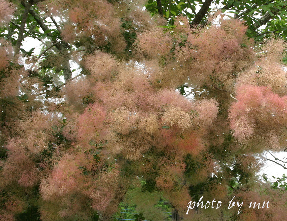 ちょうど紅花の咲く頃、煙の木も見事に咲く。この辺では珍しい花である。